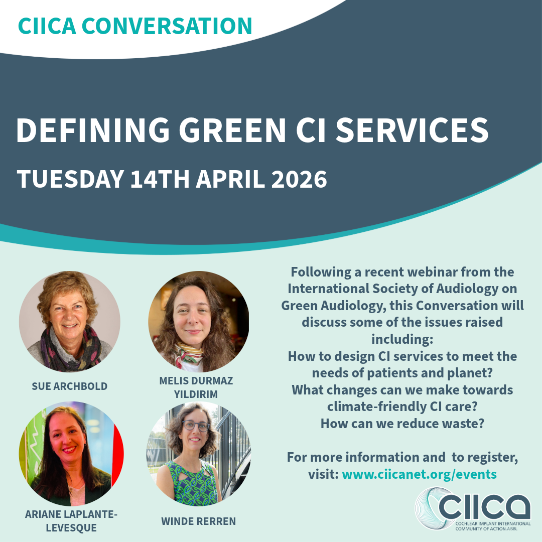Following an inspiring webinar in January 2026 hosted by the International Society of Audiology (ISA) focused on green and sustainable hearing care, we invite you to a CIICA Conversation to discuss some of the issues raised. Go to Webinars & Recordings and scroll down to find the recording and transcript.