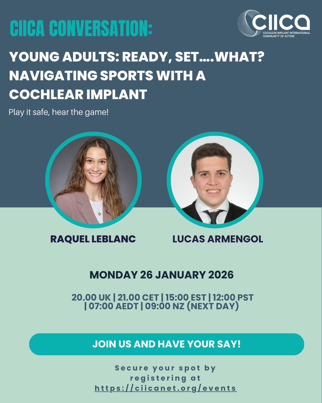This inspiring conversation for young adults, will be led by Lucas Armengol, Spain, and Raquel LeBlanc, Canada, who will share their experiences of navigating sports with a cochlear implant, the challenges faced and how to overcome them. They will be delighted to welcome your contributions and experiences too! Do join them – sports are an important part of many people’s lives – how does your deafness and CI affect your participation? Any changes you would like to see in the technology?